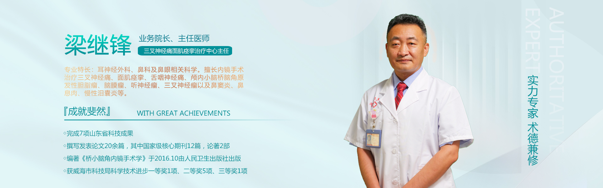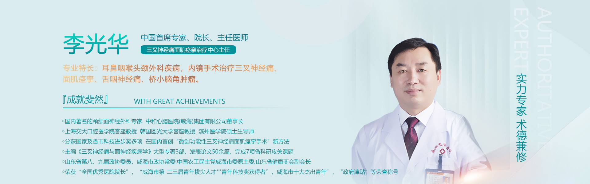 中國(guó)首席專家(jiā)、中和(hé)心腦φ↕(nǎo)醫(yī)院(威海(hǎi))集團有(yǒu)限公司董事(shì)長(chπ↓ áng)、院長(cháng)、主任醫(yī)師(shī)、三叉神經 ←¶痛面肌痙攣治療中...